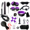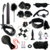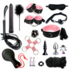Paleta de azote, Látigo, Bala vibradora,Succionador de pezoneras, Anillo retardante, Pluma para caricias, Esposas manos, Esposas pies, Antifaz, Mordaza ,Collar, Pezoneras, Plug anal en acero inoxidable, Plug anal con chupa, Dado de poses, Laso,Sujetador en X