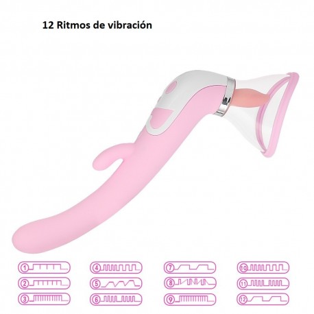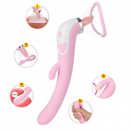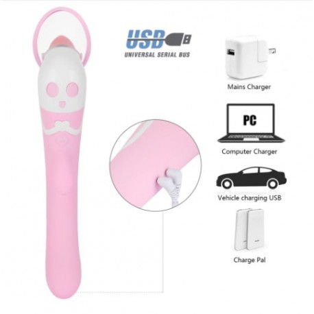 Pordero estimulador de clitoris con de lengua y succionador, en su extremo cuenta con un estimulador de clitoris y un estimulador de punto g,